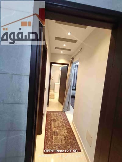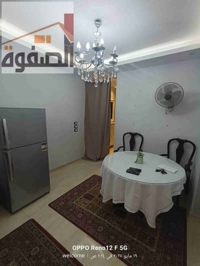 للايجار شقة مفروشة مكونة من غرفتين ورسيبشن وحمام ومطبخ الدور الرابع اسانسير يعمل عمارة فخمة موقع مميز المعراج السفلى قريب للزهراء والاوتوستراد مكيفة وبها انترنت ارضى عفش جديد موقع هادى وراقى جدا