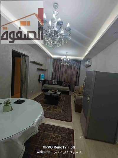 للايجار شقة مفروشة مكونة من غرفتين ورسيبشن وحمام ومطبخ الدور الرابع اسانسير يعمل عمارة فخمة موقع مميز المعراج السفلى قريب للزهراء والاوتوستراد مكيفة وبها انترنت ارضى عفش جديد موقع هادى وراقى جدا