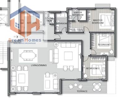التقسيم: 3 غرف نوم (منها غرفة ماستر) – 3 حمامات – ليفنج – مطبخ