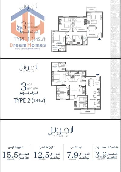 أسعار الشقق المكونة من 3 غرف ١٤٥ متر تبدأ من 3,900,000