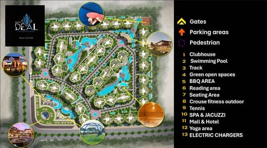 - باقي المساحة مخصصة للـ مناظر المائية، المساحات الخضراء، والخدمات الفاخرة