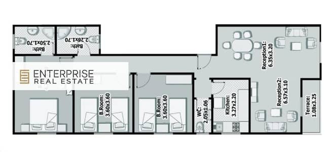 مكونة من 3 غرف نوم ( منهم غرفة ماستر ) + 3 حمام + ريسبشن كبير + مطبخ + تراس