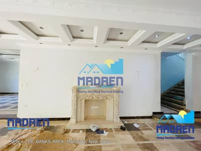 الدور الأرضي: 3 قطع ريسبشن + مطبخ + حمام ضيوف + غرفة مربية بحمام + تراس + حديقة الفيلا