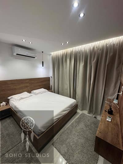 الوحدة تضم غرفة ماستر واسعة بدريسنج، ريسبشن راقٍ، مطبخ مفتوح مجهز بالكامل، وتشطيب سوبر لوكس
