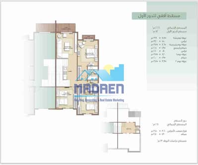 الدور الأول: 3 غرف نوم (منها غرفة ماستر)، غرفة معيشة (ليفنج).