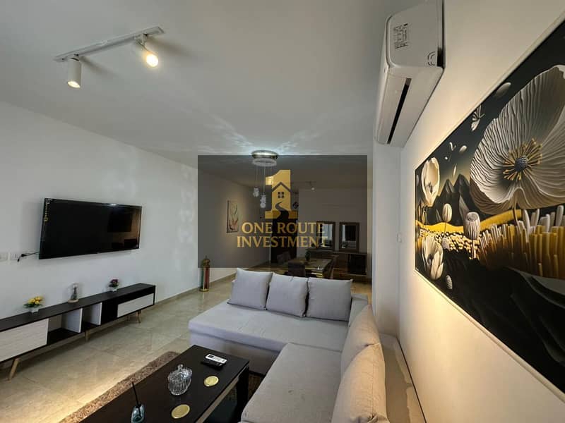 التقسيم الداخلى : ٣ غرف نوم (منهم غرفة نوم ماستر مع حمام خاص وغرفة ملابس)، ٣ حمامات، ريسيبشن واسع، مطبخ مجهز بالكامل بالأجهزة، مكيف هواء، إنترنت فايبر، وموقف خاص للسيارة