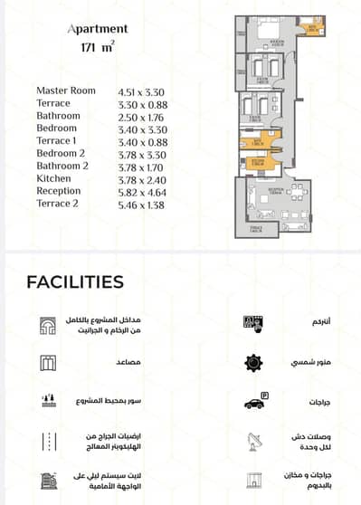 التقسيم = 3 غرف منهم غرفه ماستر +3 حمام + مطبخ + 3 تراس + ريسيبشن 3 قطع