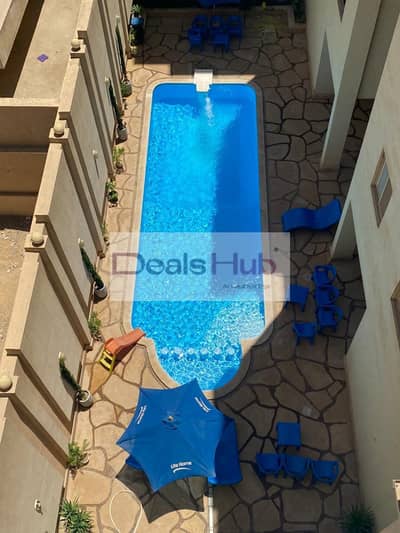 شرفة خلفية، إطلالة مفتوحة، تطل على حمام السباحة الخاص بالعمارة