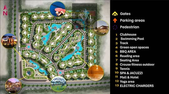 - باقي المساحة مخصصة للـ مناظر المائية، المساحات الخضراء، والخدمات الفاخرة