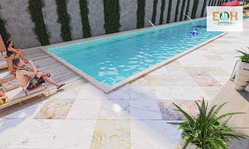• غرفة نوم واحدة، وصالة، ومطبخ، وحمام، وبلكونة تطل على حمام سباحة