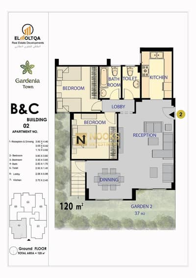- المساحة والتقسيم: شقة 120 متر مربع (غرفتين مع إمكانية التعديل لـ 3 غرف)، مع جاردن خاصة 38 متر مربع