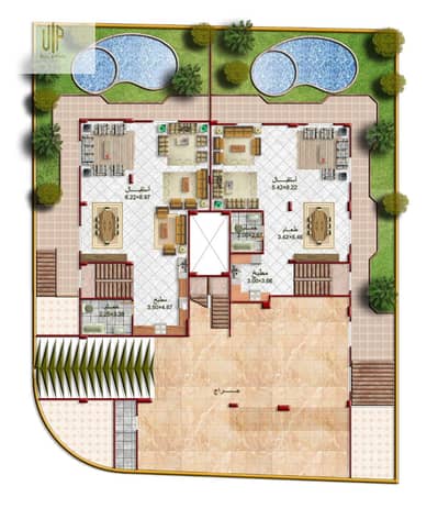 الدور الأرضي: ريسبشن 3 قطع بتراس + مطبخ + 3 غرف نوم (منها غرفة ماستر بحمام خاص) + عدد 2 حمام + 2 تراس بالغرف
