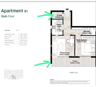 • المساحة :وحده ٧٨م٢ :غرفه ماستر و حمام ضيوف