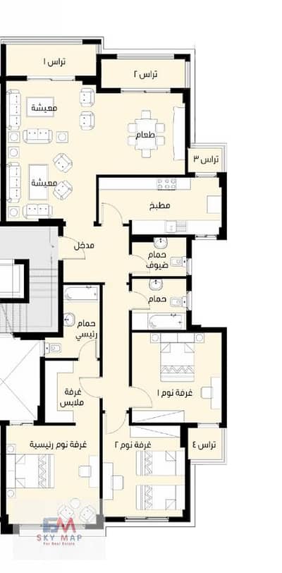 - التقسيم: 3 غرف نوم (واحدة ماستر)، 2 حمام إضافي، ريسبشن 3 قطع، مطبخ، 2 تراس