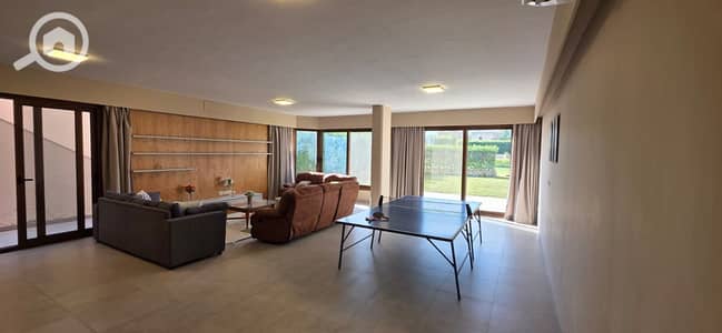 فيلا توين واسعة مفروشة بالكامل بمساحة ٥٠٠ متر مربع للإيجار في توب فيو، القاهرة الجديدة، بإطلالة على حمام السباحة وموقع مميز.