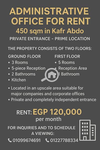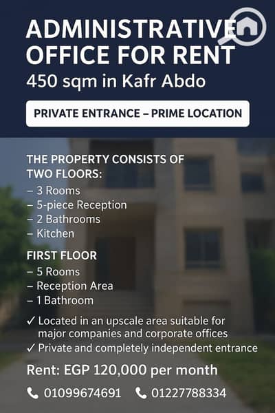 ** مقر إداري 450م للإيجار – كفر عبدهمدخل خاص – ومناسب للشركات الكبرى والعيادات