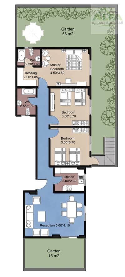 التقسيم: 3 غرف نوم + 2 حمام + مطبخ أمريكان + ريسيبشن واسع