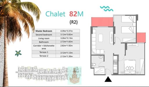 شاليه للبيع 82م – غرفتين (غرفتين – ريسيبشن – حمام – مطبخ – تيراس) ڤيو لاجون مباشر