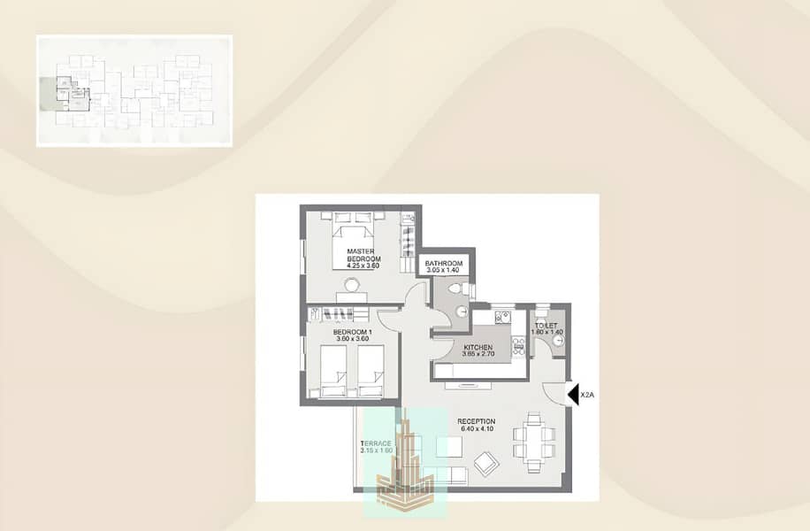 تتكوّن الوحدة من ريسبشن واسع متصل بتراس، مطبخ منفصل، غرفتي نوم إحداهما ماستر، بالإضافة إلى حمامين يوفروا أعلى درجات الراحة والخصوصية.