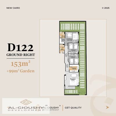 امتلك شقة أرضي مرتفع بمساحة 153 متر مع حديقة خاصة 99 متر في موقع مميز داخل قطعة D122 – الحي التكميلي، بمدخل خاص وإطلالة مفتوحة على شارع رئيسي.