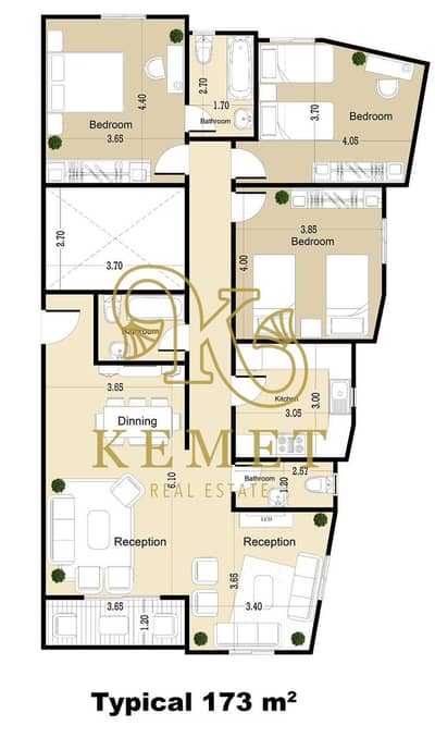 (3 غرف نوم + 3 حمام + ريسيبشن 3 قطع + مطبخ)