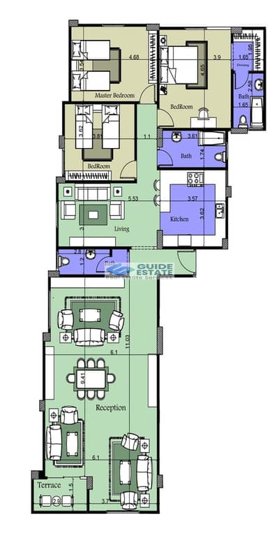 مكونة من 4 غرف نوم منهم غرفة رئيسية بحمام ودريسينج و 3 حمام وريسيبشن كبير جدا 5 قطع ومطبخ كبير وتراس