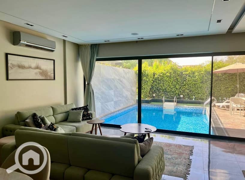 شقة بحمام سباحة خاص للايجار مفروشة بالكامل في ليك فيو ريزيدنس القاهرة الجديدة بالقرب من ميفيدا والجامعة الامريكية وهايد بارك وبالم هيلز التجمع سوديك