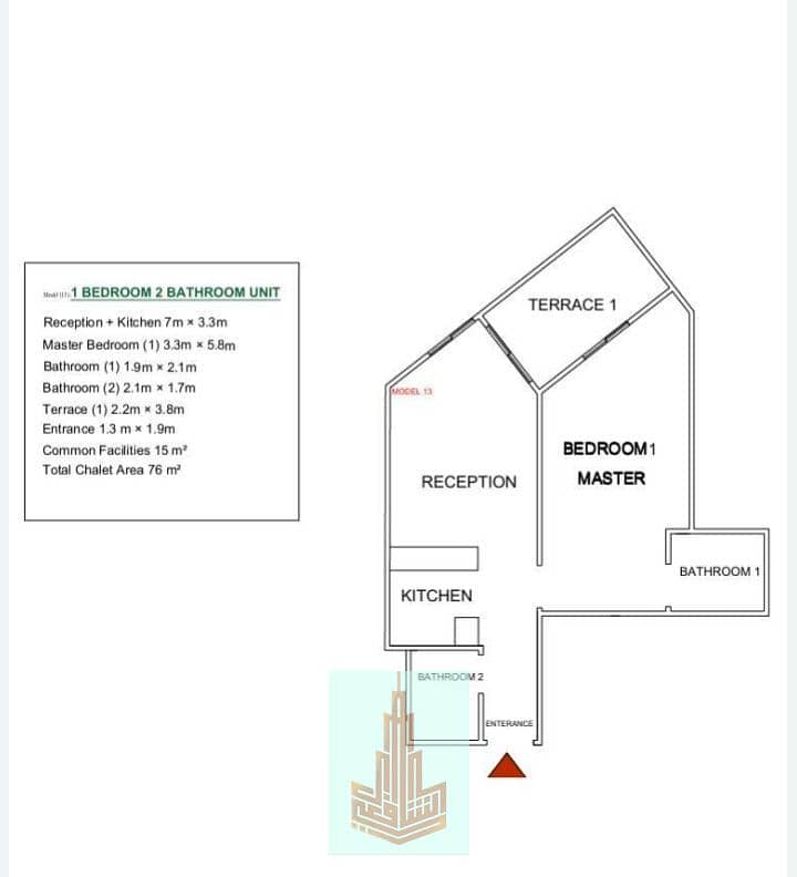 الشاليه المتاح بمساحة ٧٦ متر مربع، ويحتوي على غرفة نوم، حمامين، مطبخ، تراس، وصالة استقبال واسعة. الشاليه يتم تسليمه تشطيب كامل بدون فرش لضمان حرية العميل في تصميم الديكور حسب ذوقه. موعد التسليم المخطط له هو عام ٢٠٢٨، ما يتيح للعملاء فرصة التخطيط والاستعداد للانتقال.