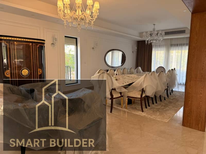 فيلا مفروشة للايجار كومباوند بالم هيلز التجمع الخامس تشطيب الترا سوبر لوكس شاملة الفرش والاجهزة والتكييفات موقع متميز جدا الفيلا بها حمام سباحة