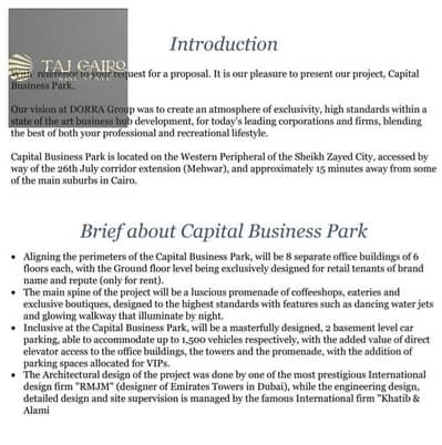 مكتب للبيع فى الشيخ زايد كابيتال بزنس بارك متأجر 250000 شهري بزياده سنويه مساحه المكتب : 150م