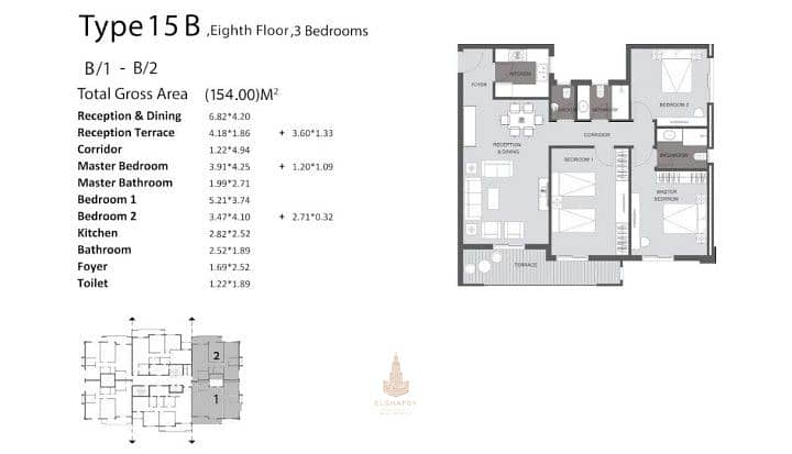 تبلغ مساحة الشقة ١٥٤ متر مربع، وتتكون من ٣ غرف نوم و٣ حمامات، بالإضافة إلى مطبخ عملي وريسبشن واسع يسمح بتقسيم مثالي، مع وجود تراس يمنح إضاءة طبيعية وتهوية ممتازة. تقع الوحدة في الدور الثامن، مما يوفر إطلالة مفتوحة وخصوصية أعلى، كما يتوفر ٢ أسانسير في كل مبنى لتسهيل الحركة والراحة للسكان.
