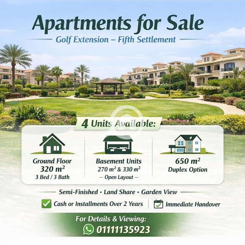 شقق للبيع في امتداد الجولف في التجمع الخامس استلام فوري كاش او بتسهيلات على سنتين