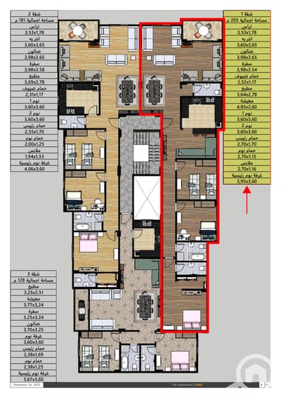 مساحة الشقة 205م مكونة من 3 غرف نوم منهم غرفة ماستر بحمام و دريسنج و 3 حمام و غرفة معيشة داخلية و مطبخ و ريسبشن 3 قطع و تراس امامي كبير