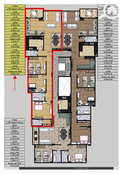 مساحة الشقة 181م مكونة من 3 غرف نوم منهم غرفة ماستر بحمام و دريسنج و 3 حمام و مطبخ و ريسبشن 3 قطع و تراس امامي كبير