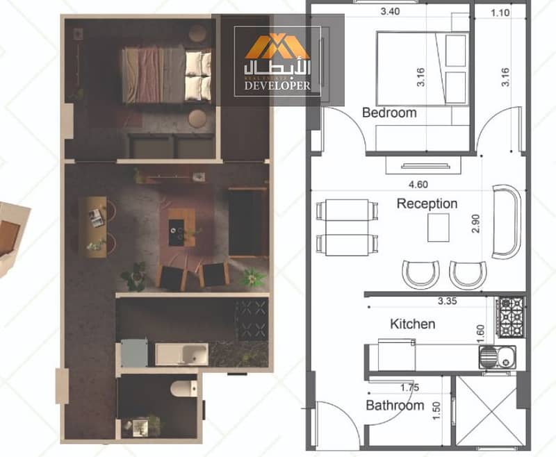 (غرفه نوم - ريسبشن - مطبخ - حمام )