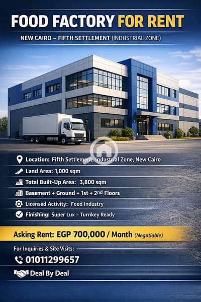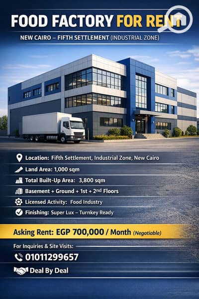 فرصة تشغيل فوري لمستثمري الصناعات الغذائية في موقع استراتيجي بالقاهرة الجديدة