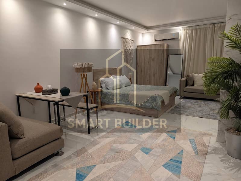 شقة ستديو مفروش للايجار اللوتس الشمالية التجمع الخامس تشطيب الترا سوبر لوكس فرش فندقي موقع متميز 2 عمارة من شارع ال90 الشمالي