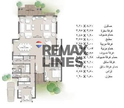 ريسبشن و 4 غرفه نوم منهم 2 غرفه ماستر بدريسينج رووم+حمام+غرفة معيشه و اوفيس و غرفه مربيه بحمام+غرفه الضيوف بحمام + غرفه للسائق بحمام +مخزن +غرفه خدمات بحمام في الرووف