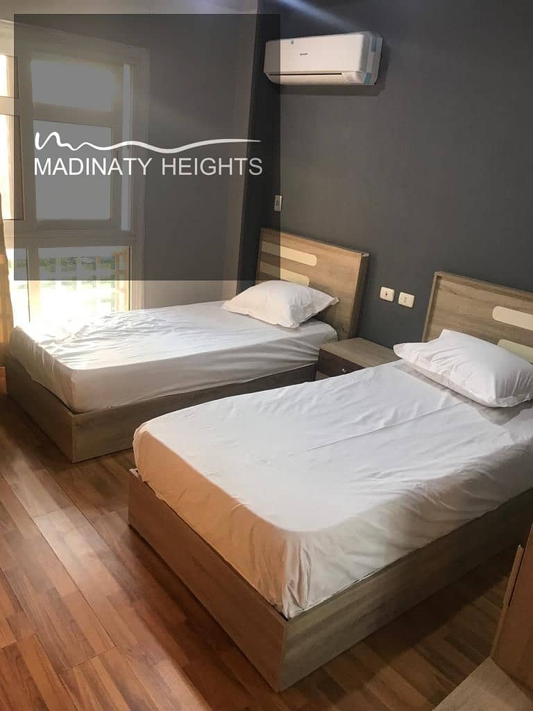 شقة 96 م مفروشة للإيجار بمدينتي B7 بموقع مميز بجوار المسجد والخدمات، دور خامس، 2 غرفة نوم و2 حمام منهم ماستر، مكيفة بالكامل وفرش مودرن