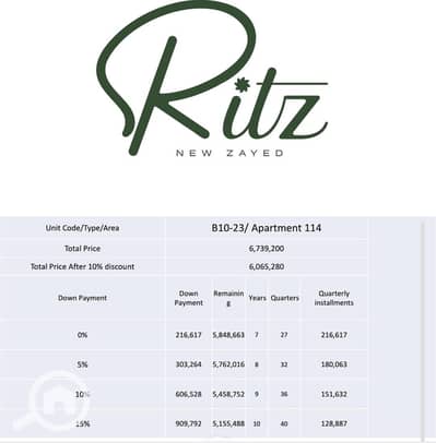 امتلك شقة بمساحة 114 متر مربع داخل مشروع Ritz New Zayed أحد أرقى مشروعات الشيخ زايد، بتصميم عصري وتشطيب مميز يوفر لك الراحة والخصوصية.