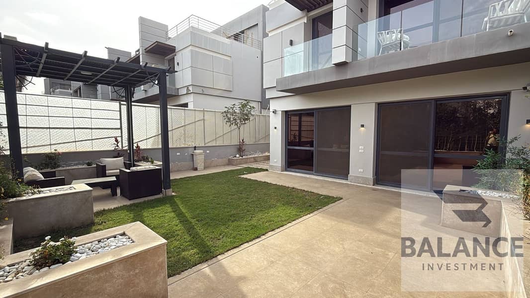 توين هاوس للبيع لقطة داخل كمبوند الباتيو الزهراء – أرضي وأول وروف – تشطيب ألترا سوبر لوكس وفرش مودرن كامل، مساحة أرض 275م ومبانٍ 255م، فيو مفتوح على ح