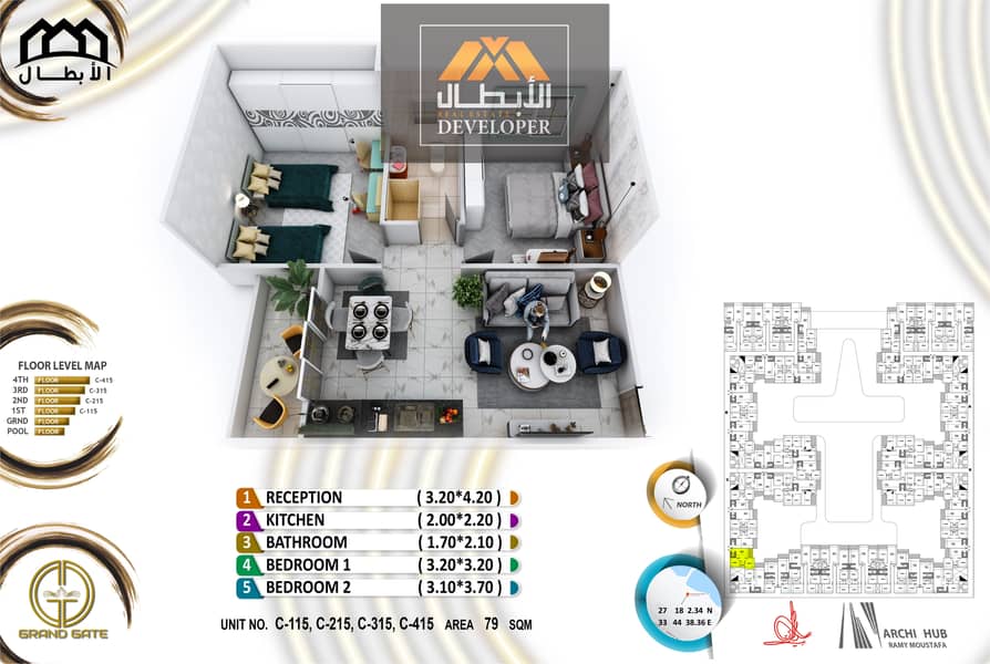 شقة 79م مشروع جرانت جيت طريق المطار (عقد اخضر) تسليم تشطيب كامل
