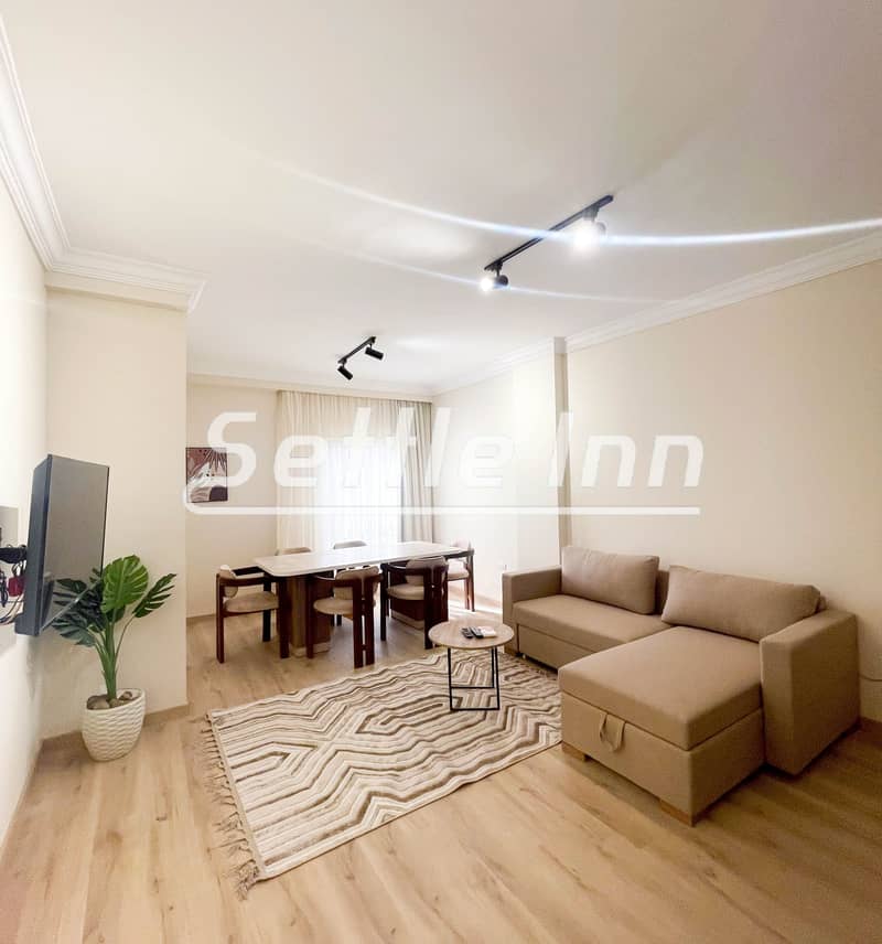 تتميز الشقة بتصميم عصري يشمل غرفتي نوم واسعتين، منطقة معيشة مريحة، مطبخ مجهز بالكامل، وحمام نظيف ومُعتنى به جيدًا. +wifi