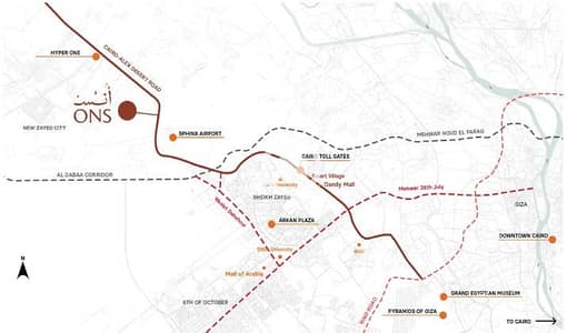 الموقع المتميزيتمتع ONS New Zayed بموقع قوي جدًا، حيث يقع مباشرة أمام مطار سفنكس الدولي وعلى مقربة من طريق القاهرة – الإسكندرية الصحراوي، ما يمنحه سهولة وصول ممتازة إلى أهم المناطق الحيوية، مثل: