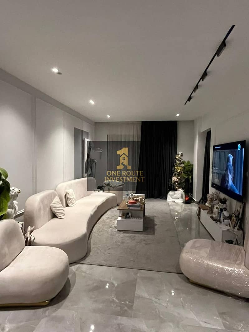 التقسيم الداخلى : 2 غرفة نوم منهم ماستر مع دريسنج و حمام خاص و 2 حمام (ماستر + ضيوف) و غرفة غسيل / تخزين و ريسيبشن كبير مع مطبخ أمريكي مفتوح و 2 تراس
