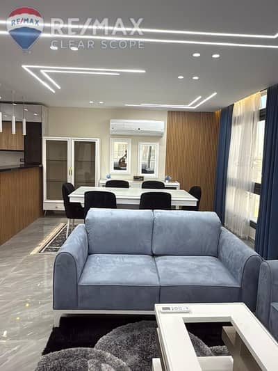 شقة فاخرة مفروشة بالكامل، بموقع استراتيجي أمام الجامعة الأمريكية بالقاهرة (AUC)، تطل على حمام السباحة في أحد أرقى مناطق الكمباوند.