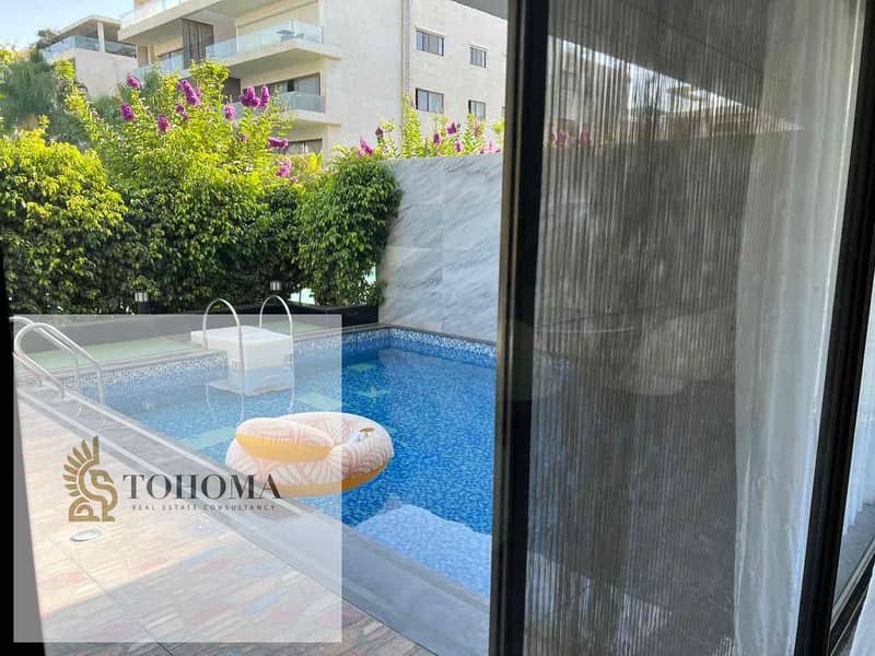 شقة أرضي بحديقة وحمام سباحة خاص للإيجار في ليك فيو ريزيدنس