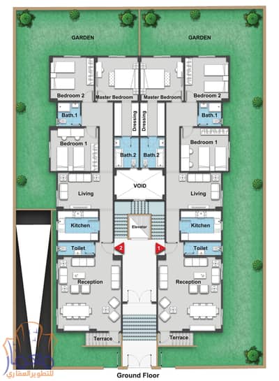 شقة دور أرضي بجاردن خاصة، أمامية بإطلالة مفتوحة مباشرة على شارع رئيسي بعرض 24 متر، ما يوفر خصوصية عالية وإضاءة طبيعية ممتازة.
