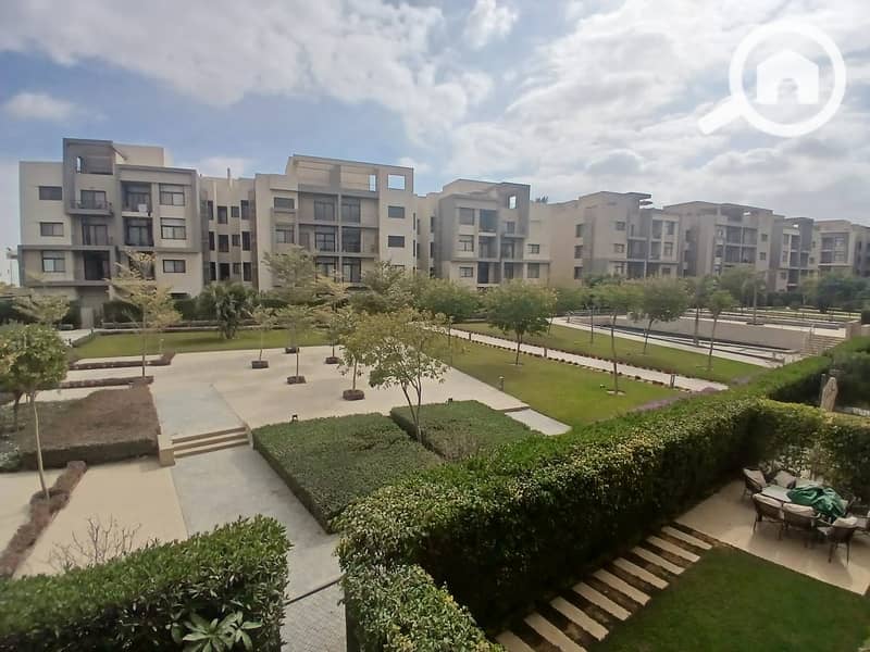 شقة للإيجار في كمبوند فيفث اسكوير نص مفروش بالمطبخ والتكييفات فيو علي لاندسكيب مباشرة