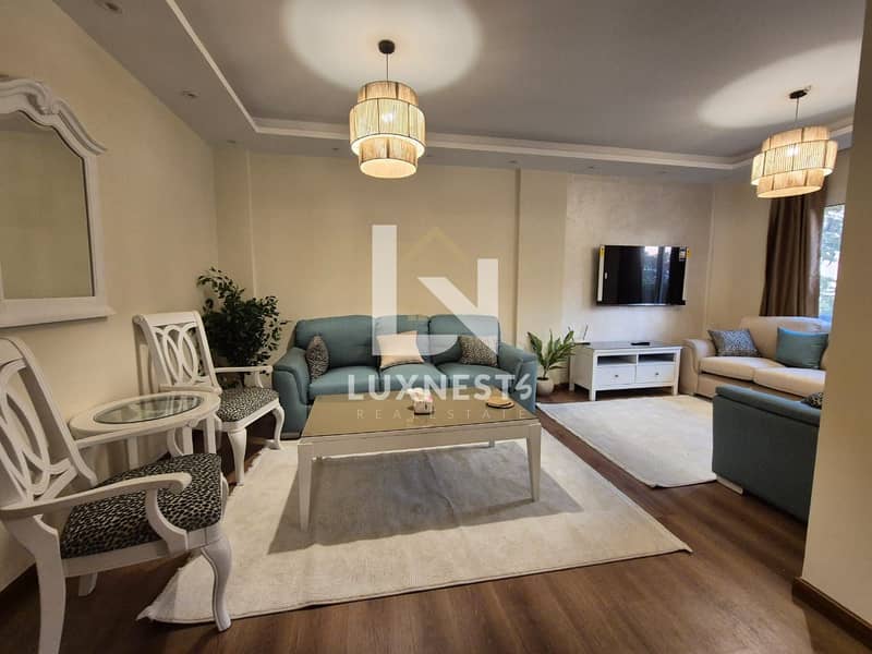 شقة للإيجار في مدينة الرحاب، مفروشة بالكامل فرش مودرن جدًا، بإطلالة مفتوحة على حديقة، وتشطيب كامل.